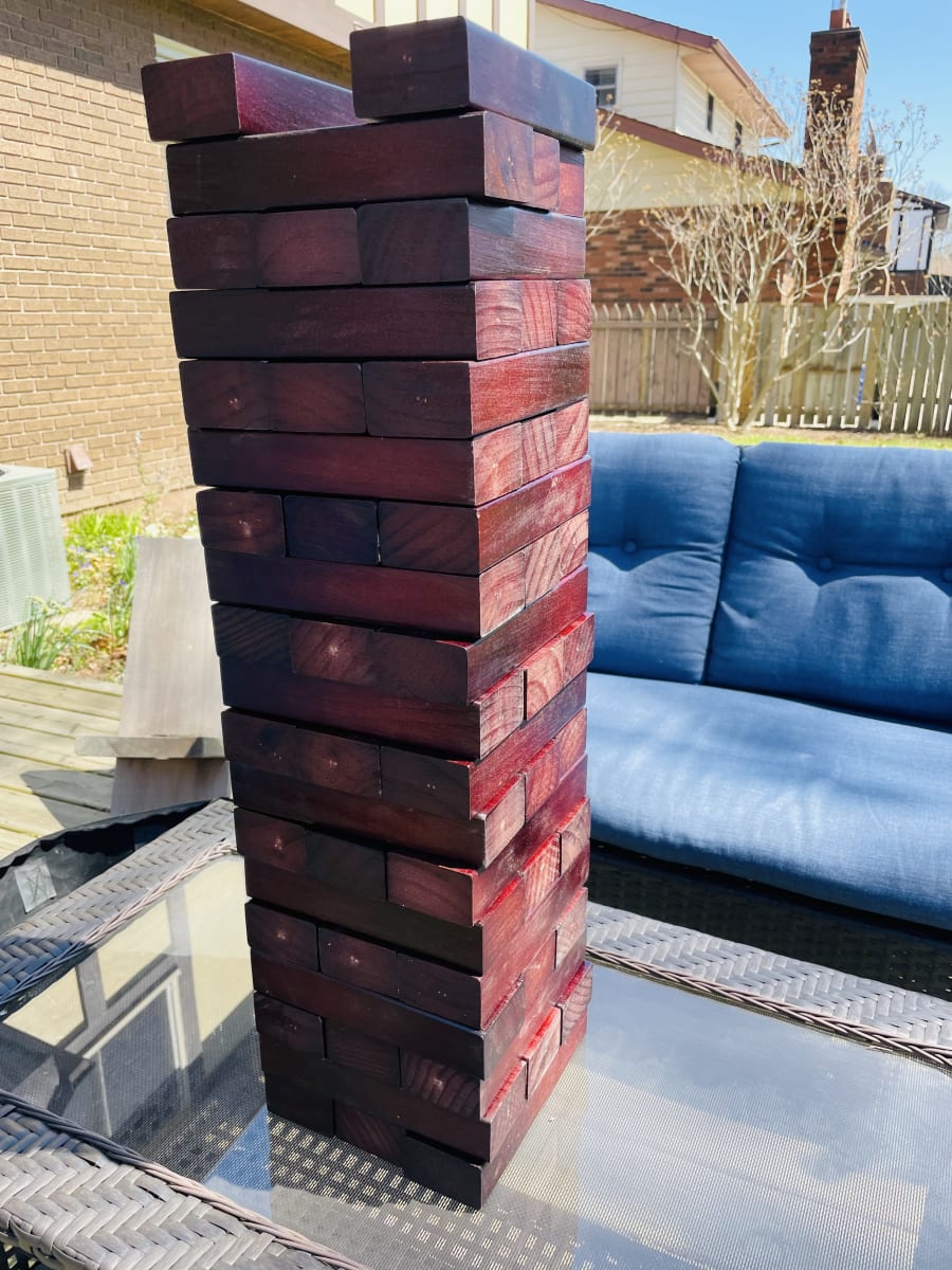Anticipation builds to a crashing climax! Over 8 times the size of classic Jenga game blocks! Get creative -- personalize your Jenga giant rules to create your own Jenga giant game variations. Be the champion! -- the unofficial record for the highest Jenga giant tower is 44 levels! Think you can beat that? For 1 or more players, ages 8 to adult. Starts at 2 feet tall and grows to over 4 feet as you play.