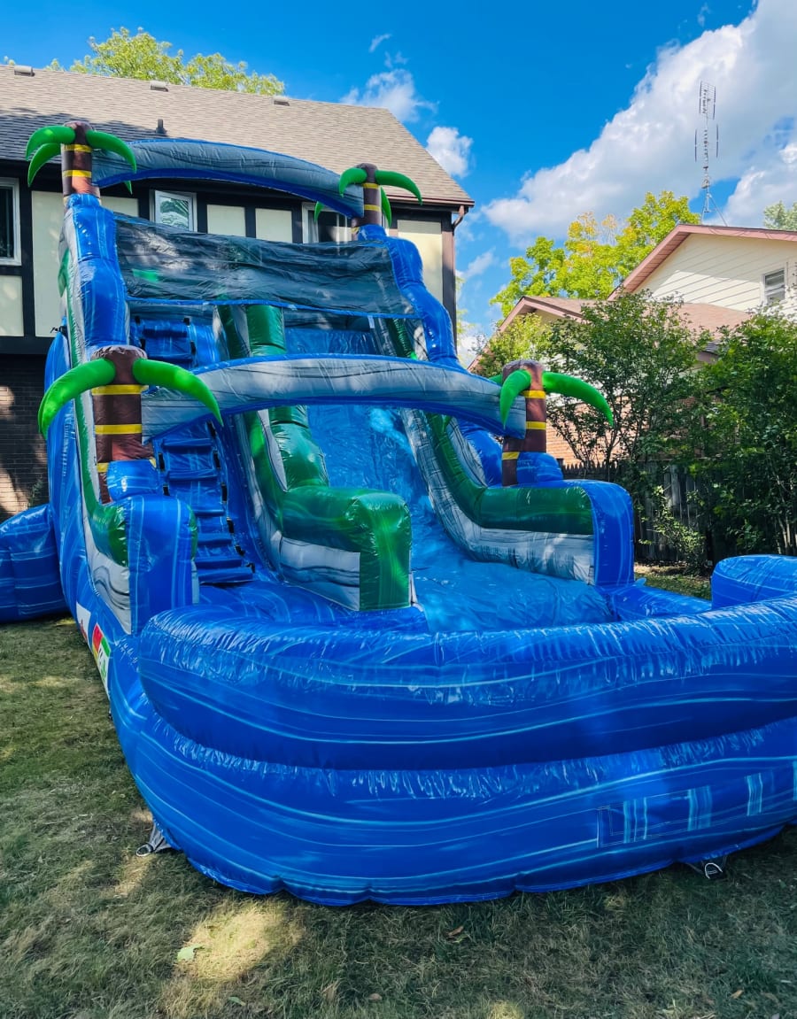At over 24 feet tall and 28 feet long, our tropical themed blue crush wet slide with a pool will sure to be a hit at any party or event! Huge fun for those long hot summer days. Beat the heat bring the water park to you!