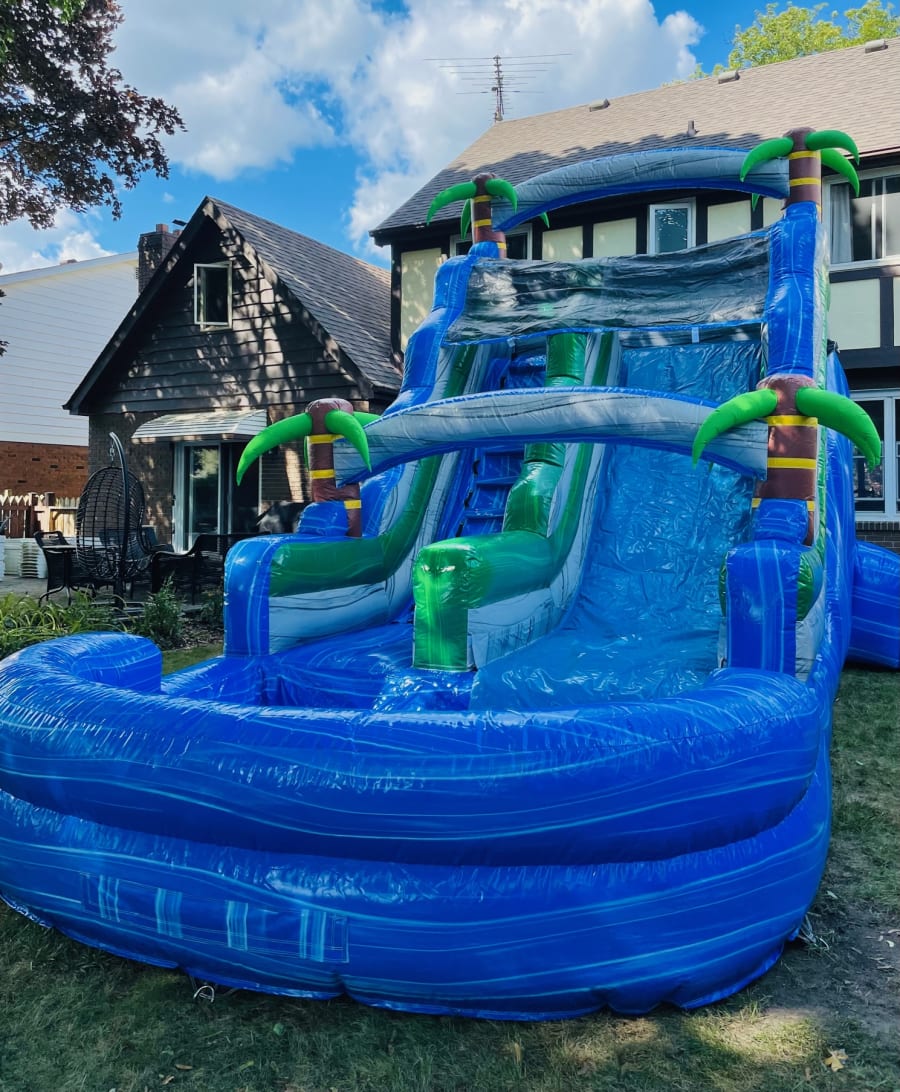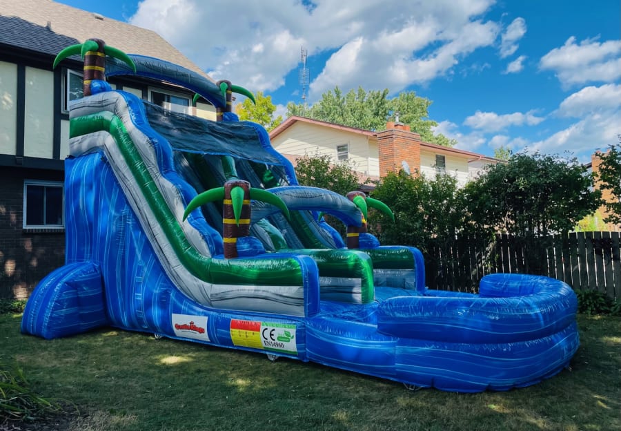 At over 24 feet tall and 28 feet long, our tropical themed blue crush wet slide with a pool will sure to be a hit at any party or event! Huge fun for those long hot summer days. Beat the heat bring the water park to you!