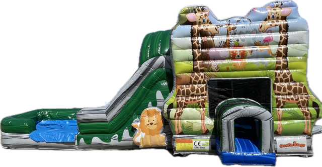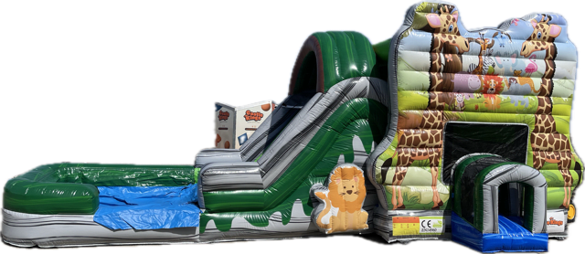 Take a safari adventure! The perfect combo for animal lovers. Lions, Giraffes, Hippos, and zebras, will really make your party wild. This combo is complete with a bounce area, and slide that can be used wet or dry.