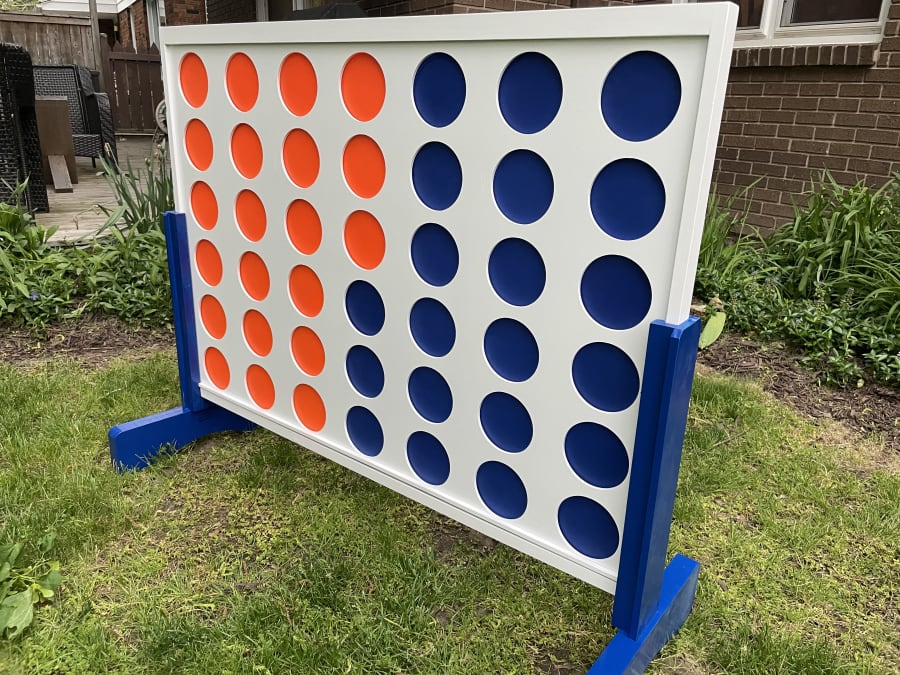 Giant 4 is the blown up version of the classic table-top 4 in a row game. This giant game, however, can be played on the floor indoors or out in the yard! Board measures approximately 4 feet wide by 3 feet tall. Two players (or teams) drop coins in from the top of the board alternating turns trying to get 4 in a row. To win you or your team must be the first to join 4 of your color coins in a row either horizontally, vertically, or diagonally! Simply slide out the wooden bottom bar when finished to release the coins. Store the coins in the game when finished playing. This wooden game is perfect for parties, BBQs, tailgating, group events, family gatherings, and much more!