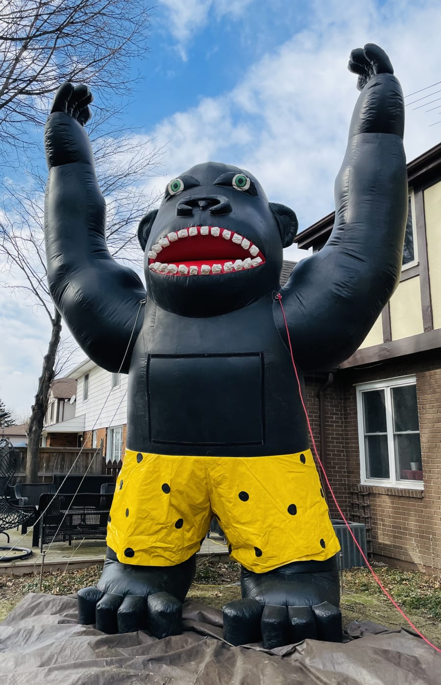 Gordie the Gorilla will help you celebrate BIG! This is our biggest front yard inflatable for the biggest yards and the biggest celebrations. Gordie is 25 feet tall, 15 feet wide and 10 feet deep. He needs a lot of space to spread out, but sure does attract a crowd.