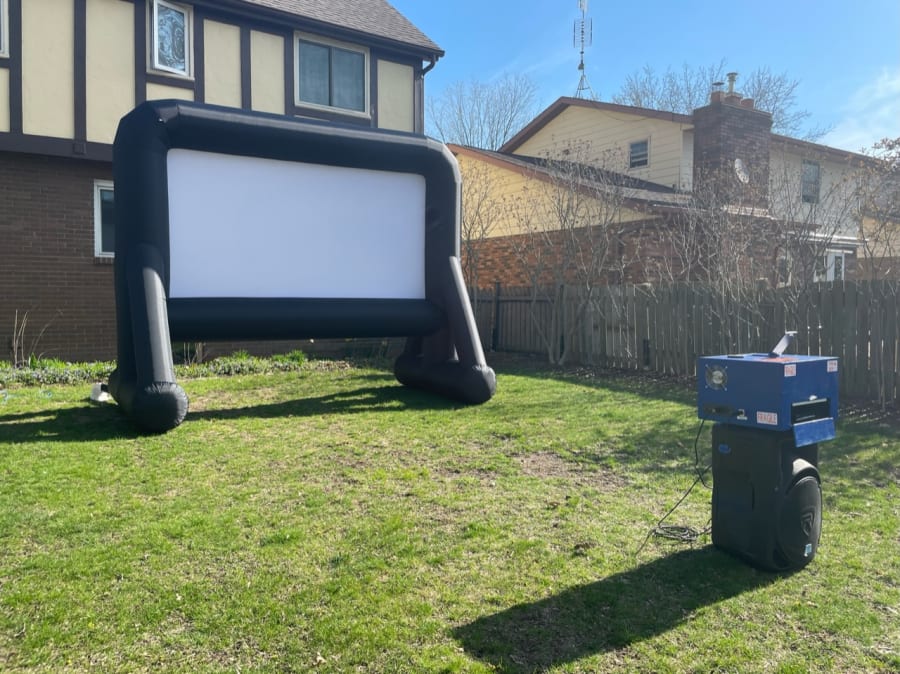 This package includes all the basics for a DIY backyard movie package plus our easy to use screen. You will get our lightweight easy to use blow up movie screen, 15 inch speaker, Projector, BluRay player, cords and cables all in one neat easy to use package. Total space for the full set up is about 25 feet by 25 feet.